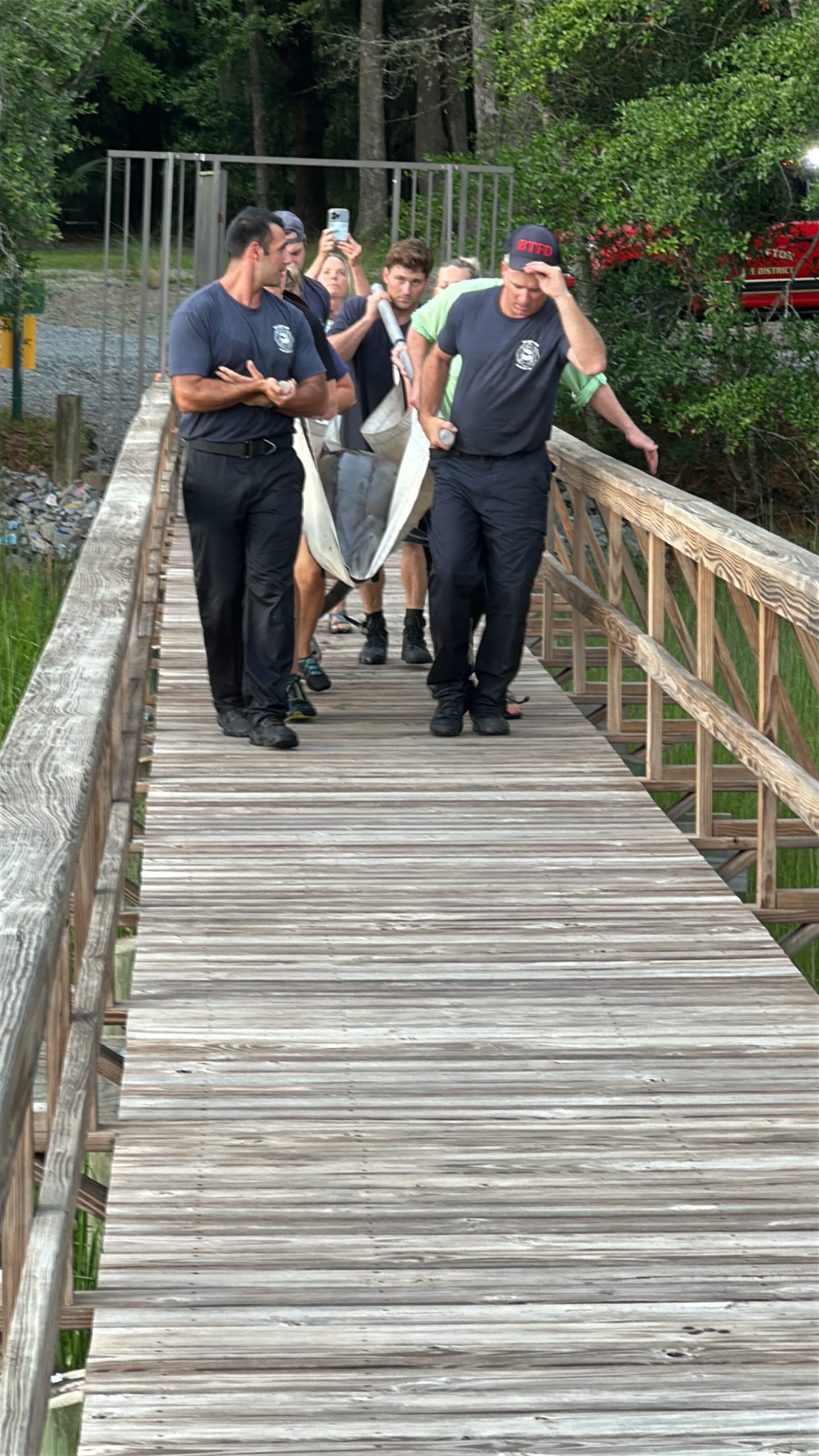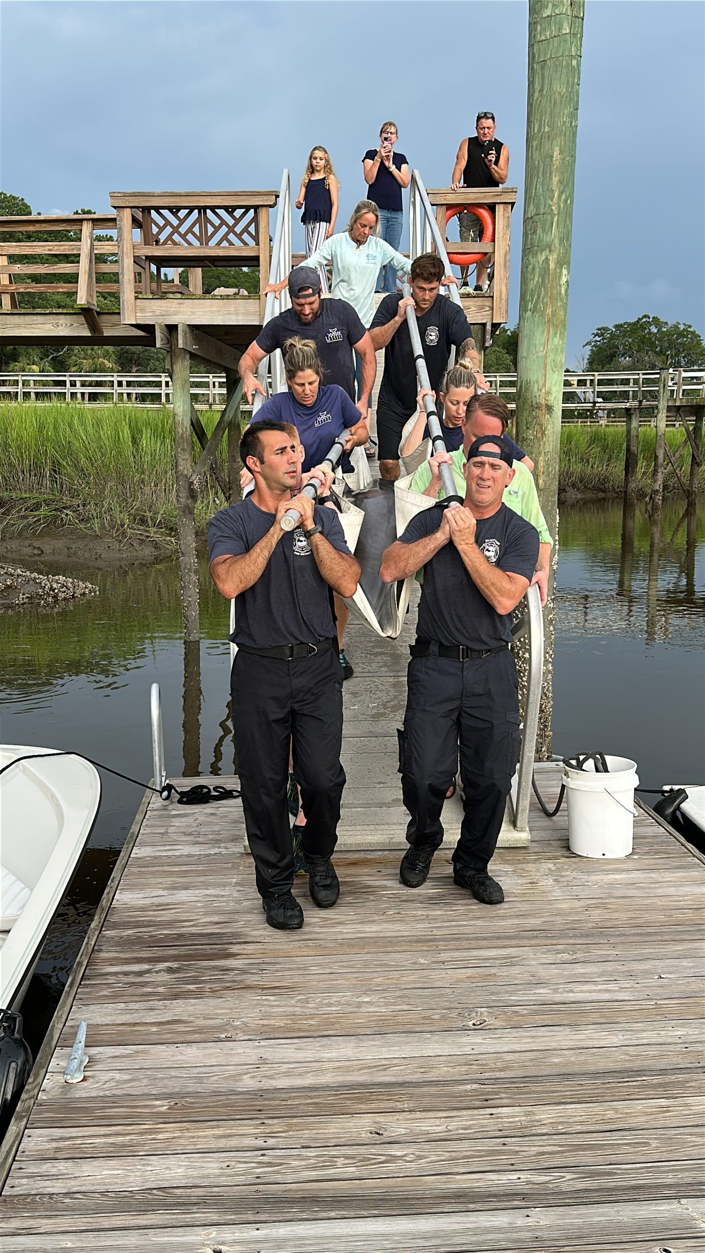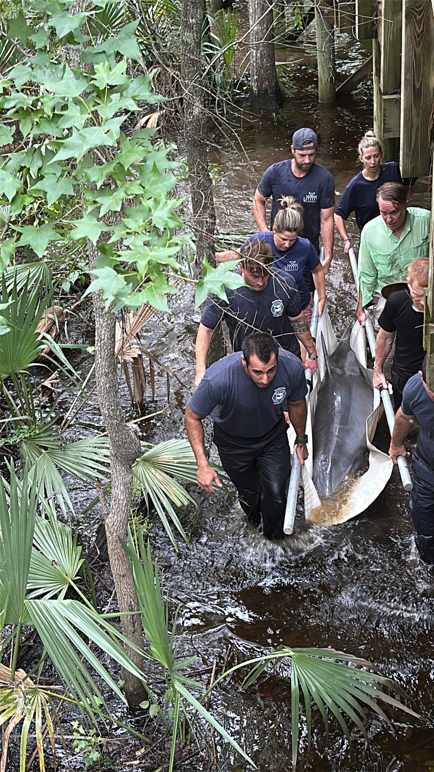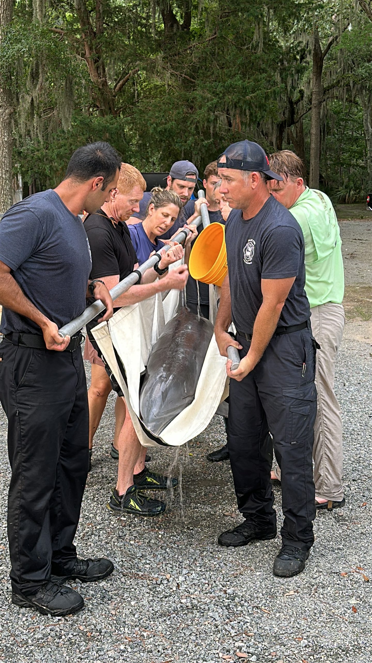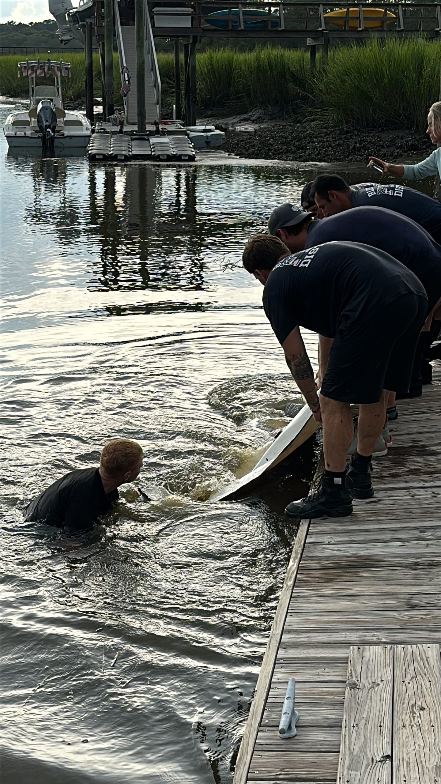 Rescue 335 responded shortly after 4:00 p.m., deploying firefighters specially trained in technical water rescue as part of South Carolina Regional Response Team 4. Working alongside the LMMN team and residents Michael Smith and Thomas Layer, crews attempted to corral the dolphin using a specially designed marine rescue tarp with stabilizing poles. Although Lucky initially swam farther into the lagoon, the team regrouped and eventually guided her safely onto the tarp.