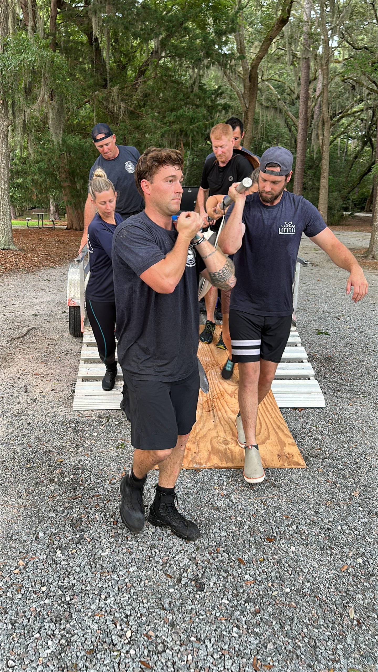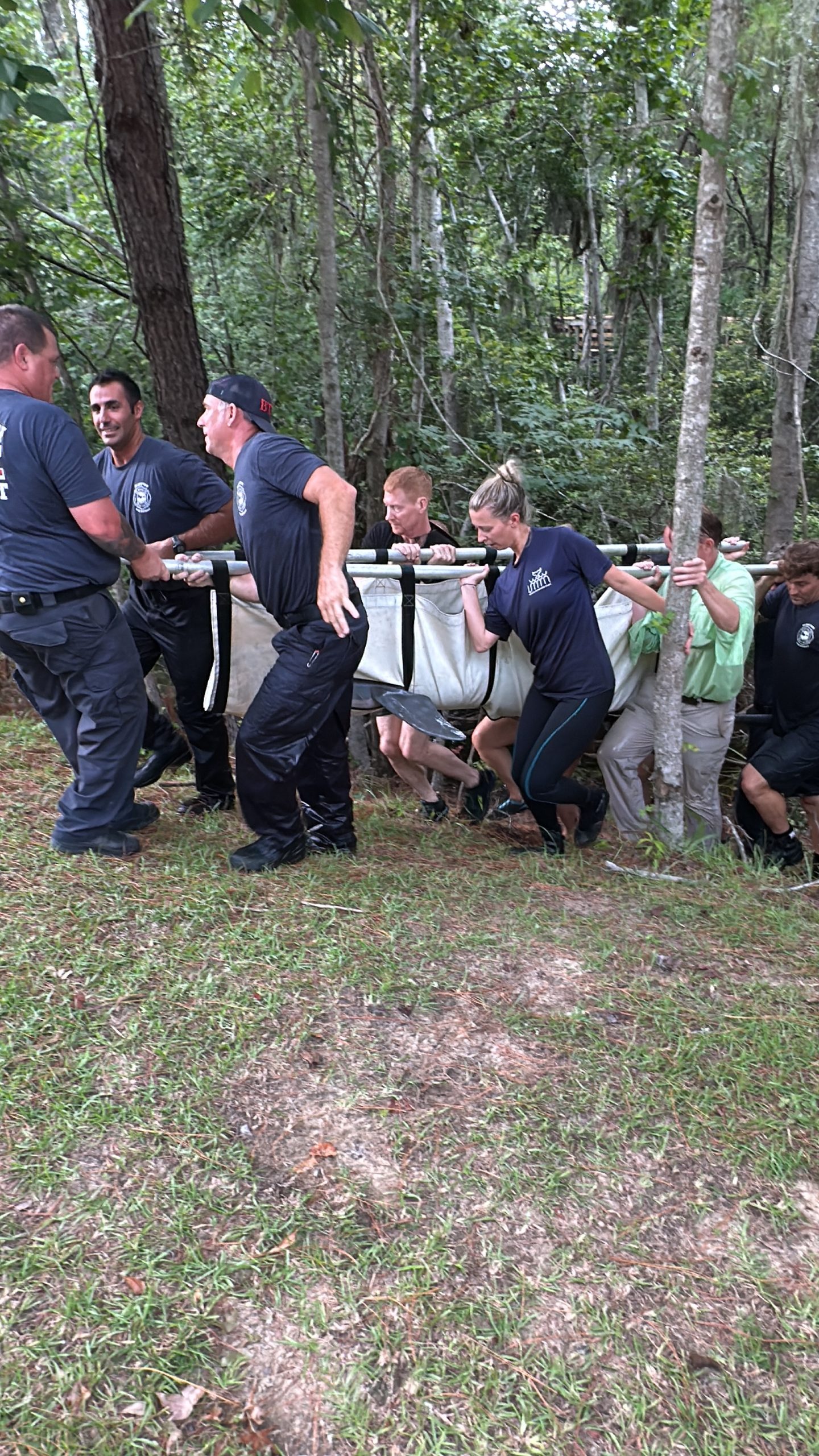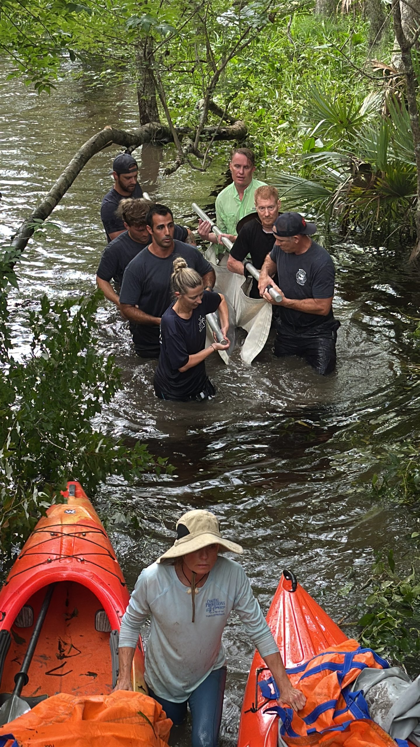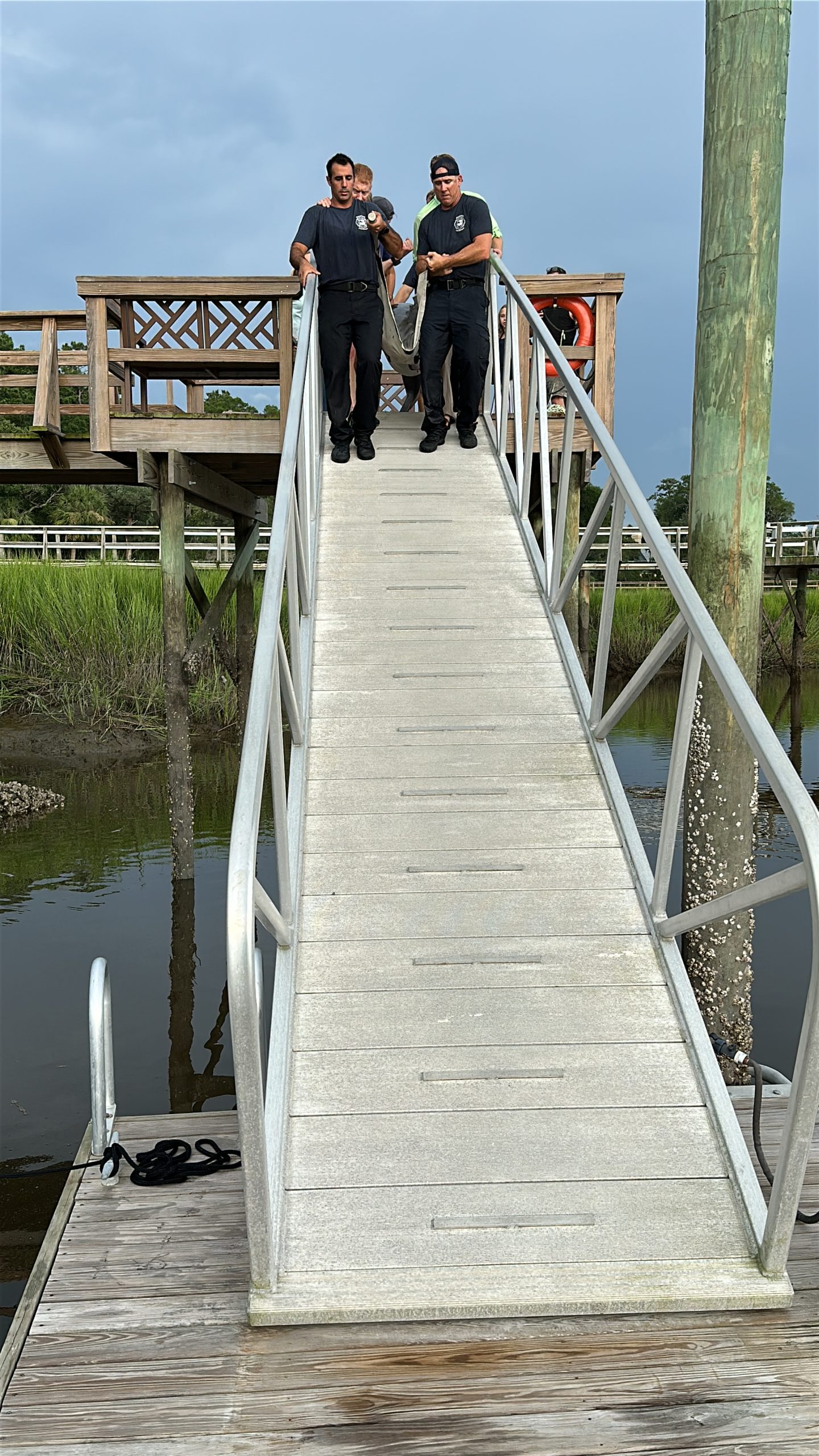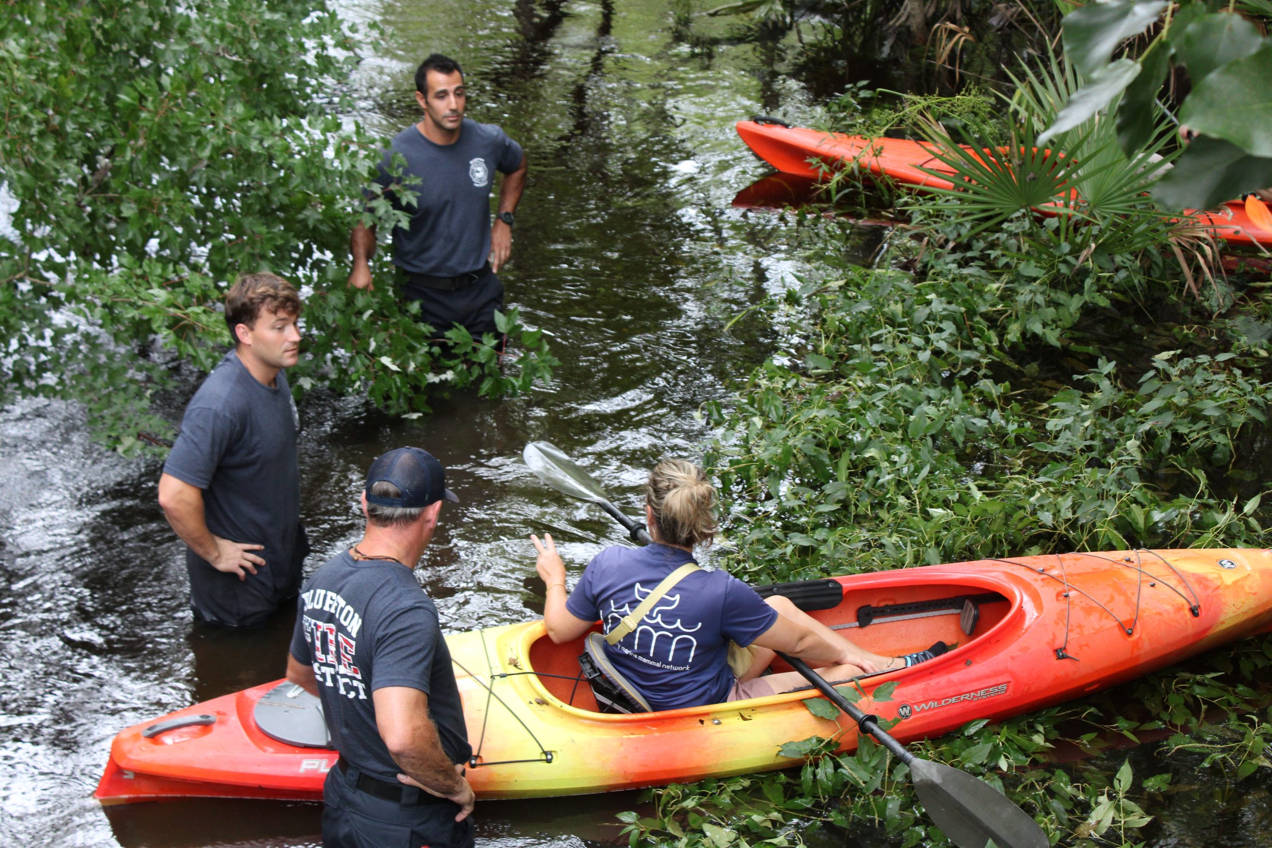Rescue 335 responded shortly after 4:00 p.m., deploying firefighters specially trained in technical water rescue as part of South Carolina Regional Response Team 4. Working alongside the LMMN team and residents Michael Smith and Thomas Layer, crews attempted to corral the dolphin using a specially designed marine rescue tarp with stabilizing poles. Although Lucky initially swam farther into the lagoon, the team regrouped and eventually guided her safely onto the tarp.