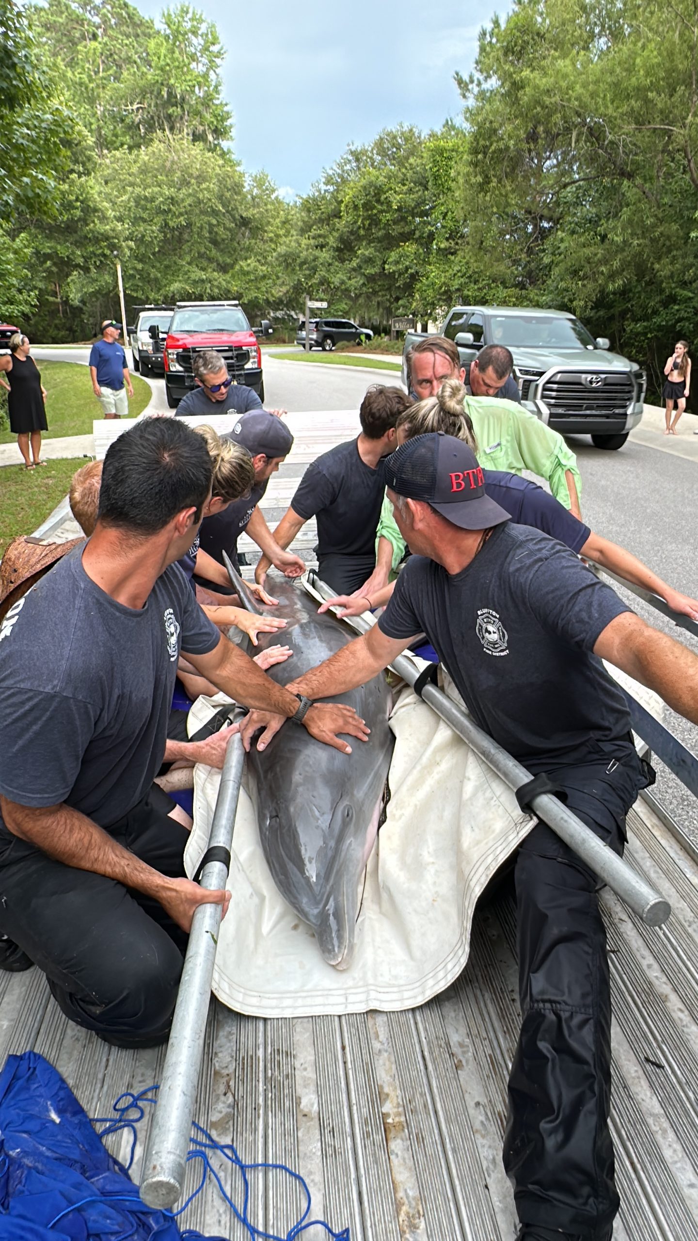 LMMN received the call at 12:15 p.m. and deployed a team from Charleston, including Lauren Rust (Executive Director), Tracy Kowalczyk, John Kane, and local volunteer Amber Kuehn. Once on scene, the team determined they would need additional help to safely secure and transport the dolphin. At 3:45 p.m., they contacted BTFD for support.